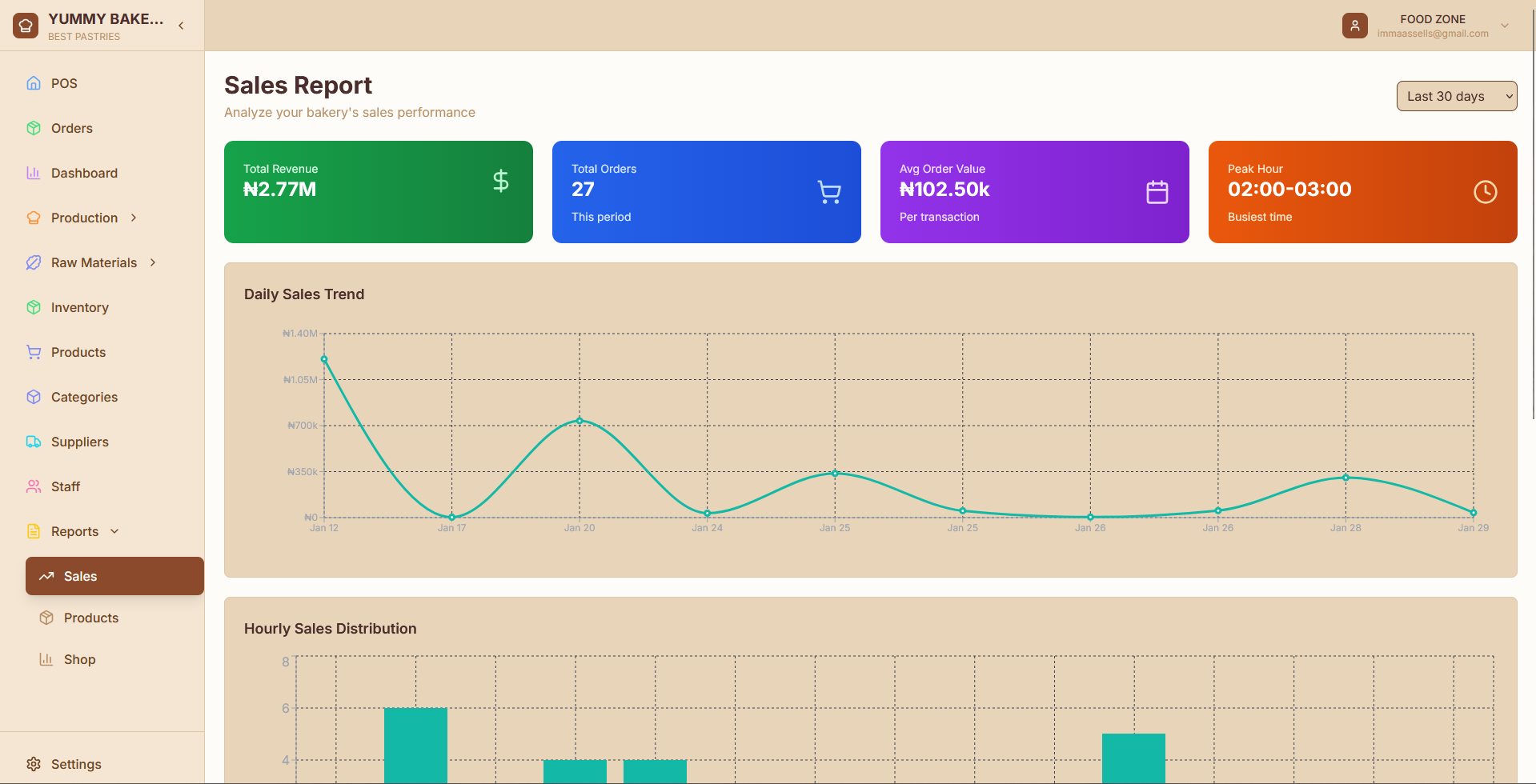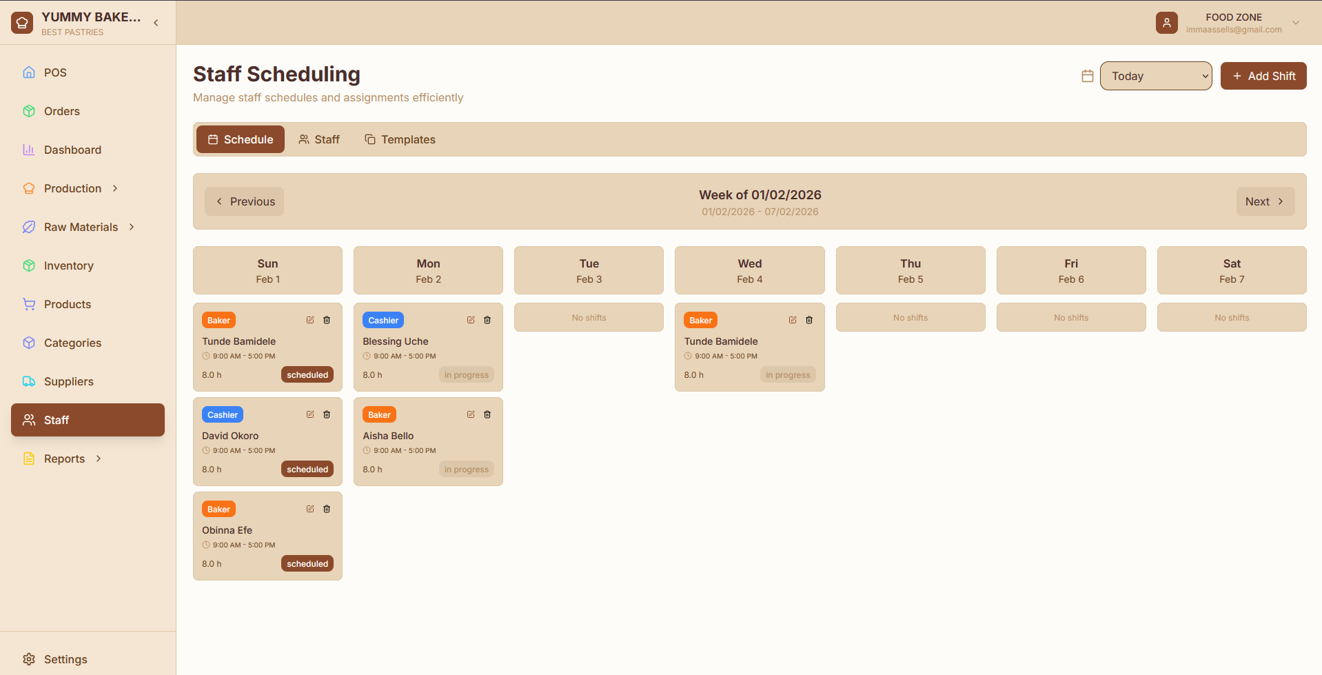 Manage multiple users with role-based permissions for admins, managers, and bakers.